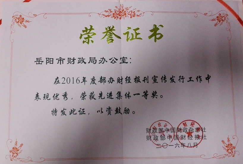 2016年度部办财经报刊宣传发行工作先进集体一等奖