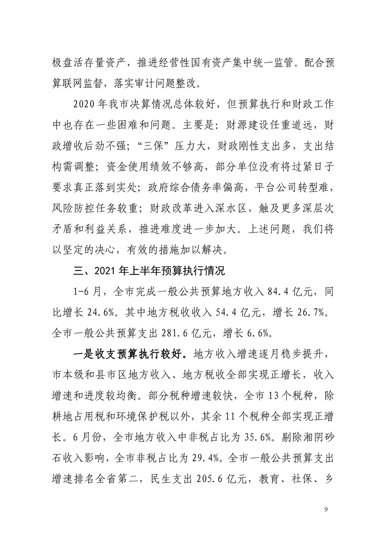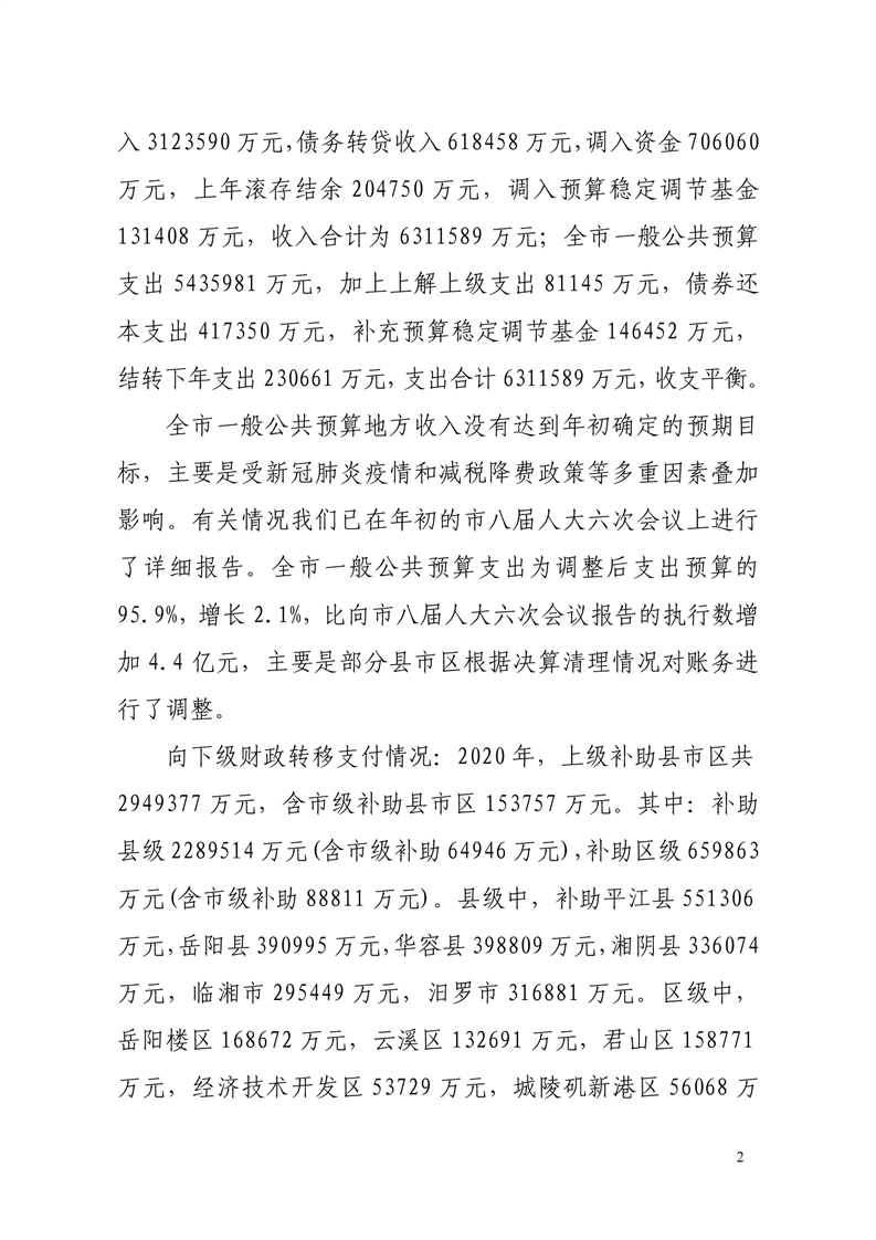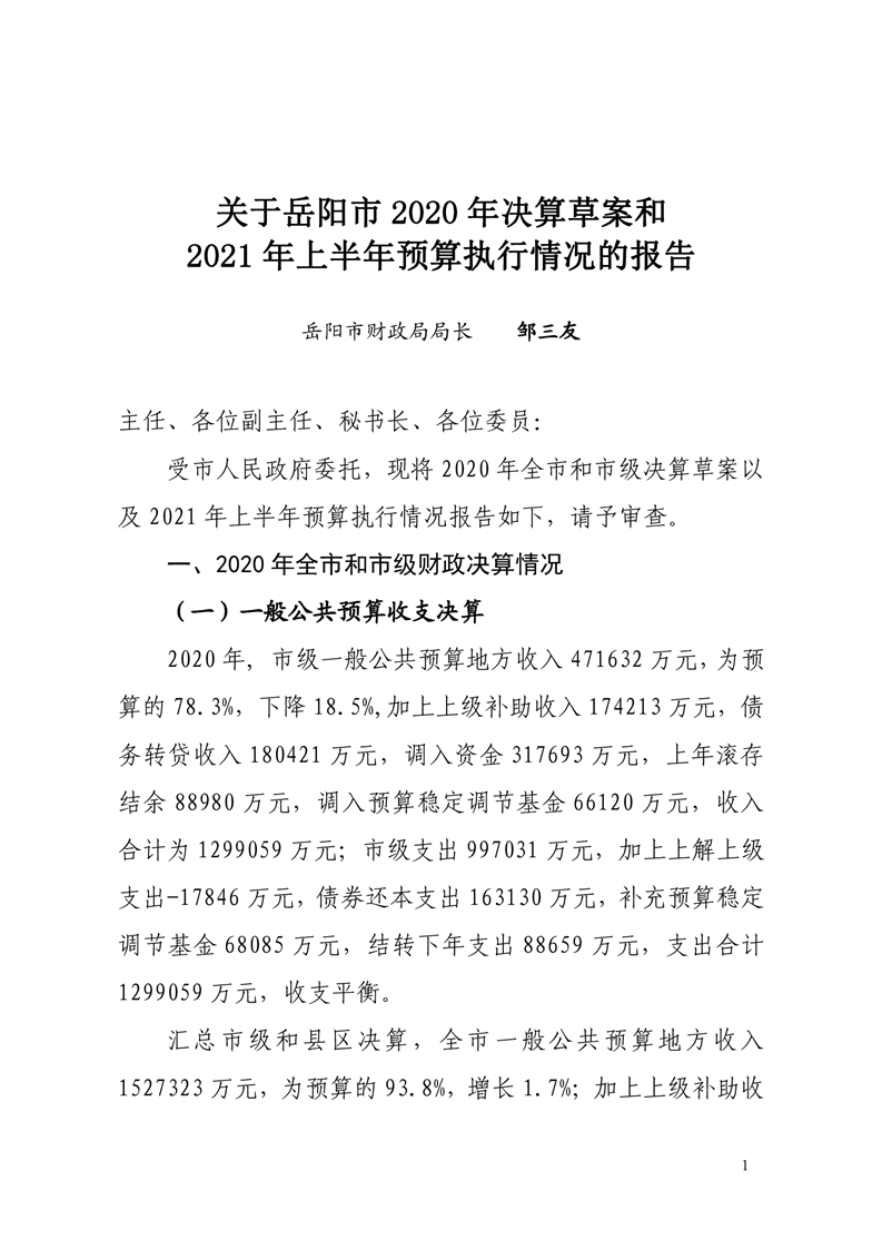 关于岳阳市2020年财政决算草案和2021年上半年预算执行情况的报告