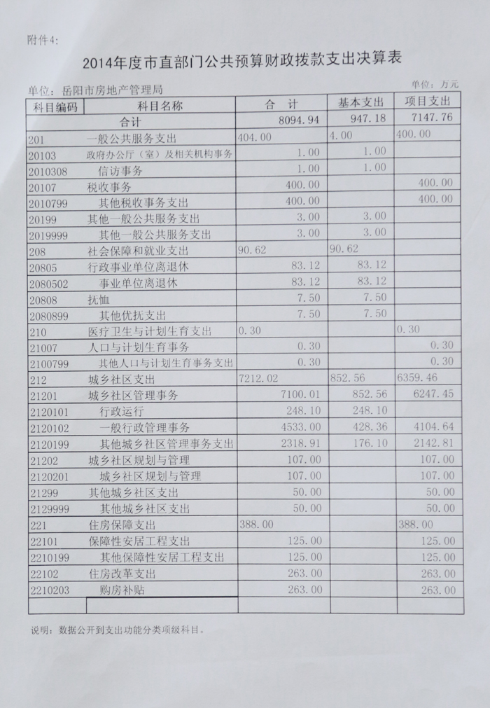 岳阳市房地产管理局2014年度市直部门公共预算财政拨款支出决算总表