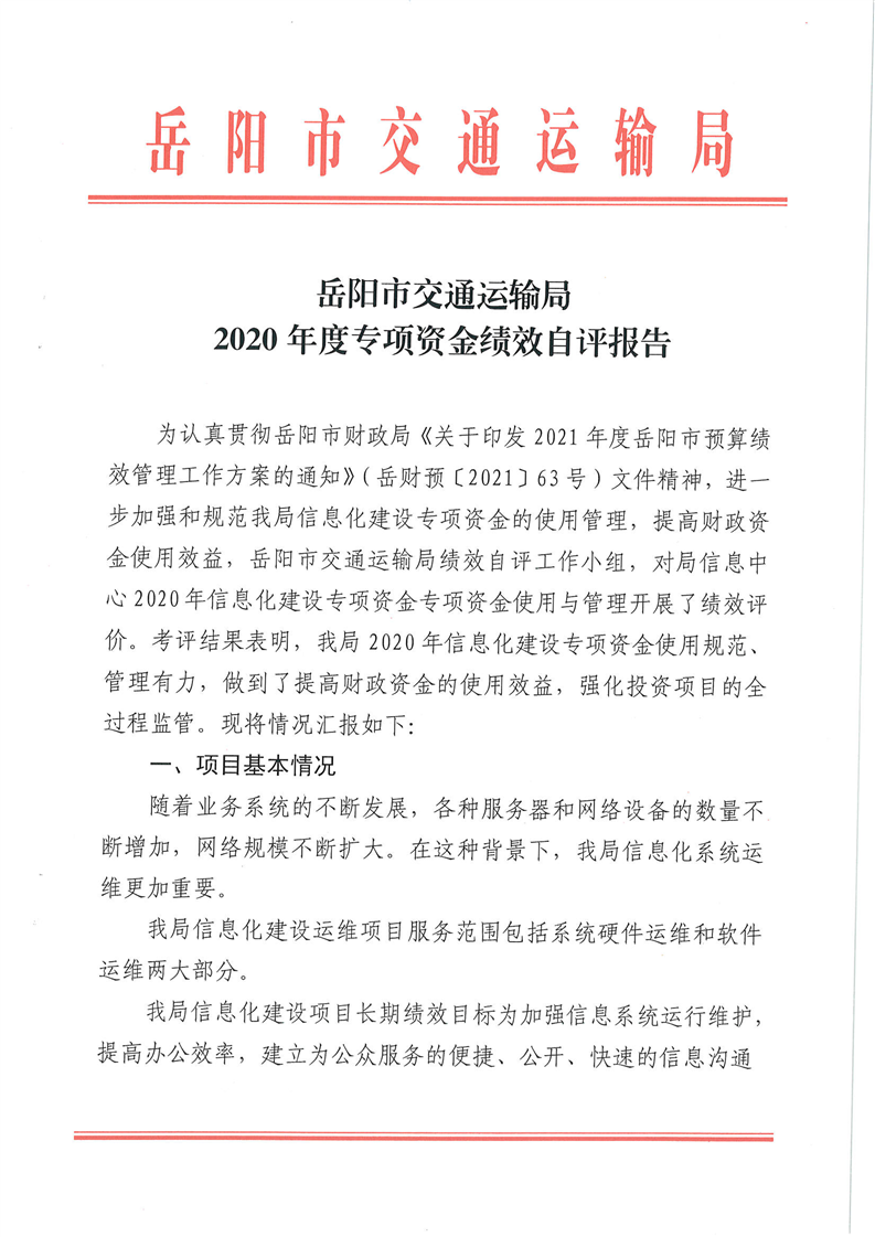 岳阳市交通运输局2020年度专项资金绩效自评报告