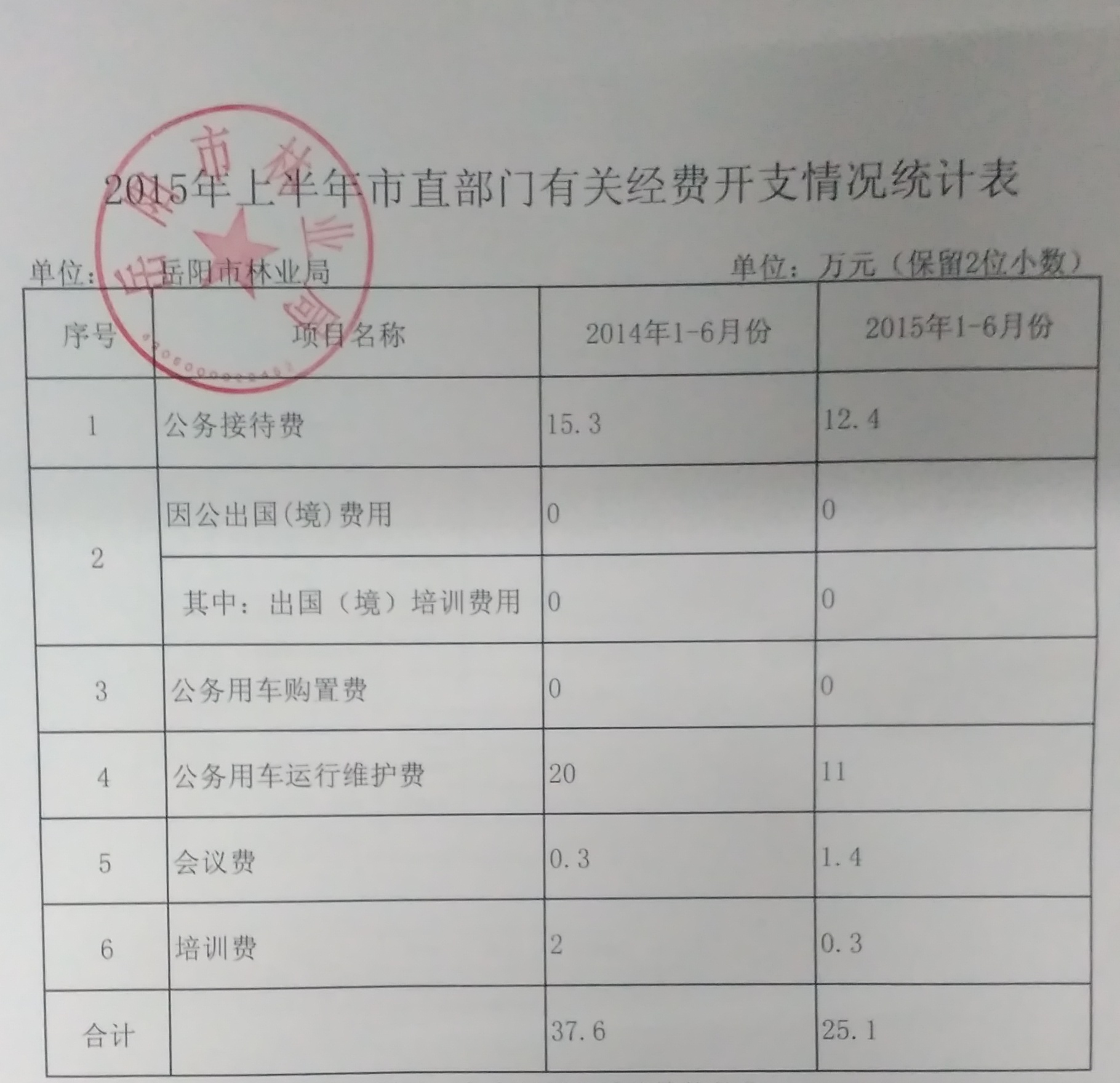 2015年上半年林业局开支情况统计表