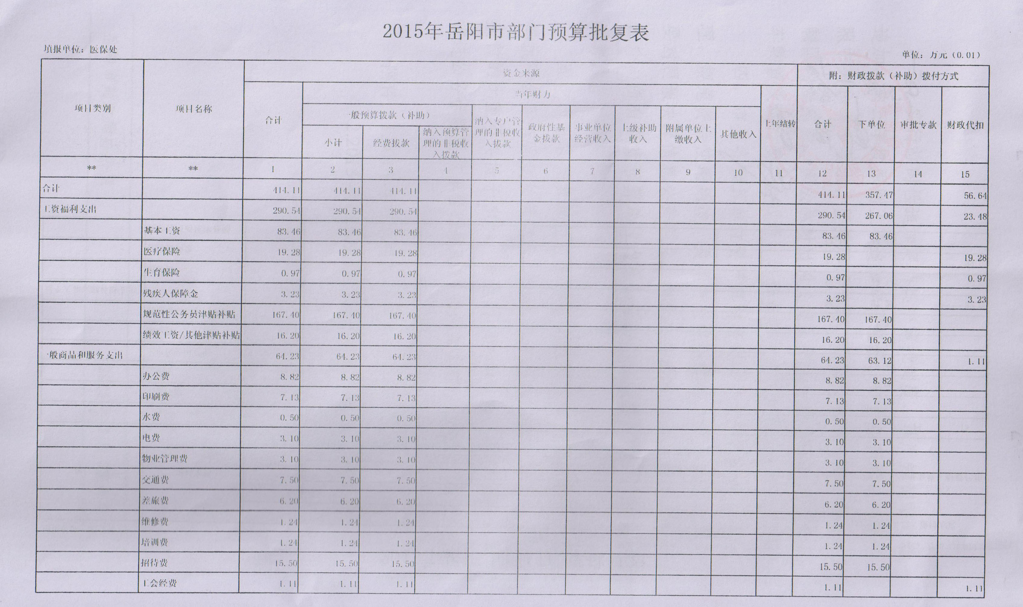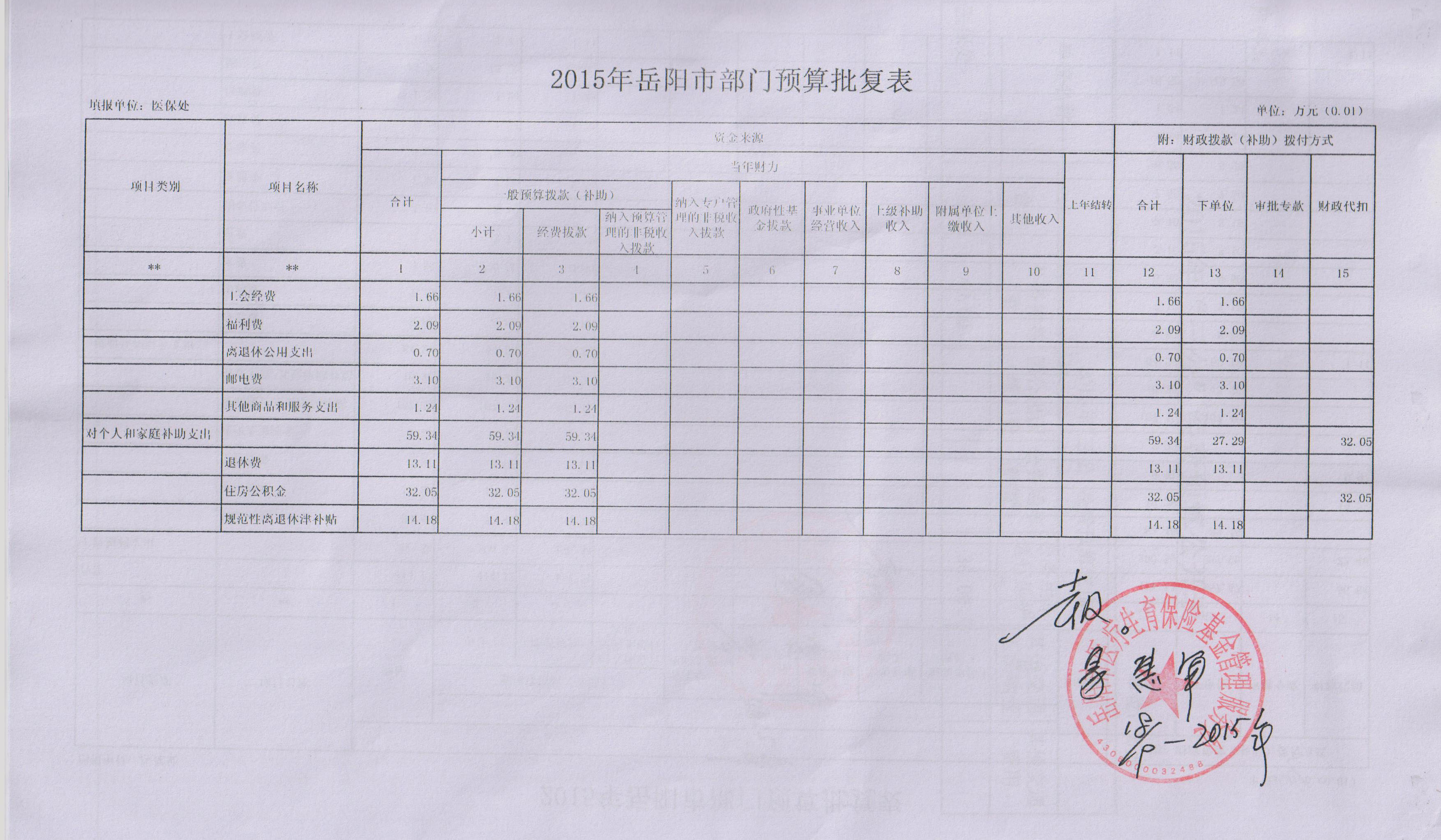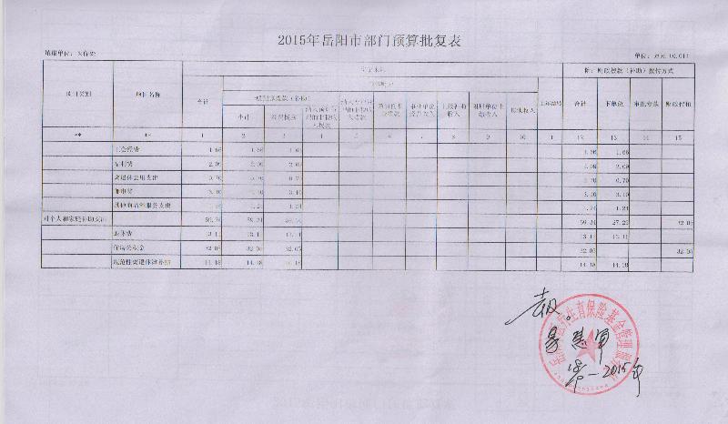 2015年岳阳市人社医保处预算批复表