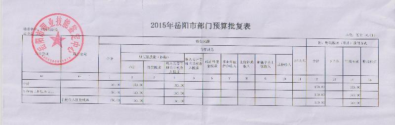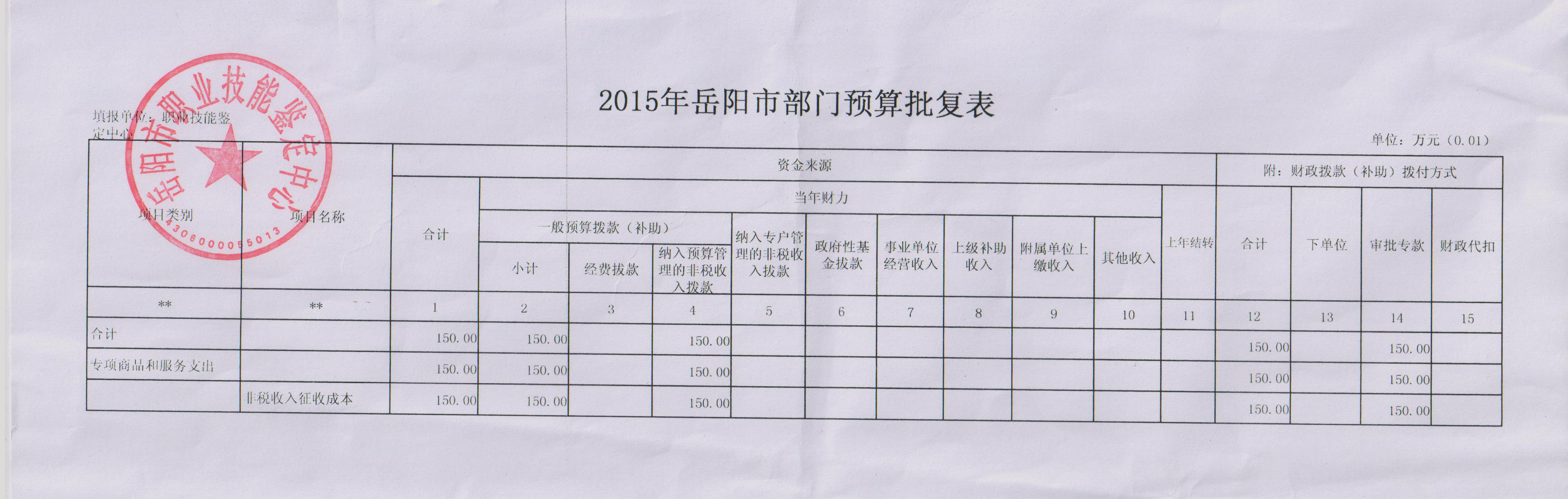 2015年岳阳市人社局职业技能鉴定中心预算批复表
