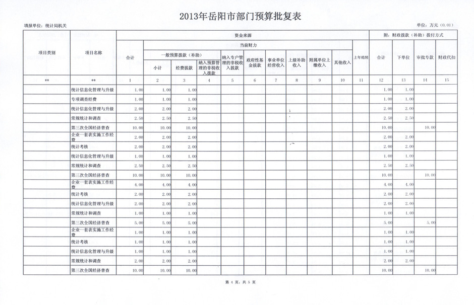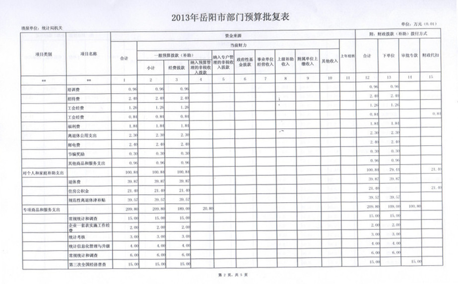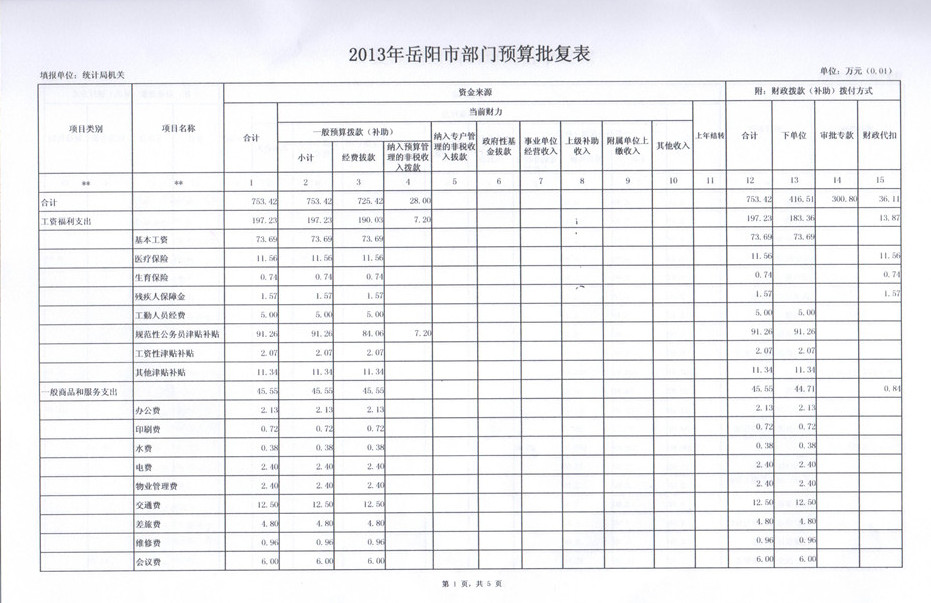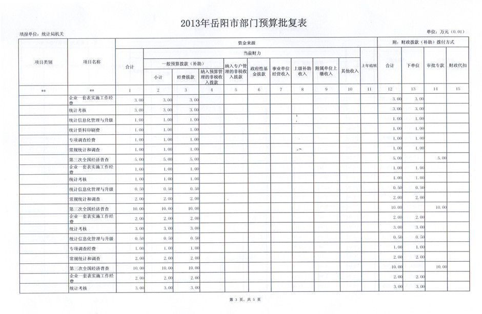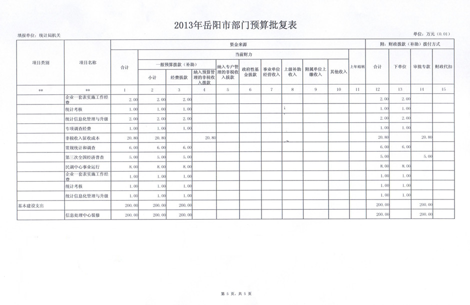 2013年岳阳市统计局部门预算批复表