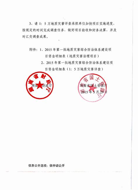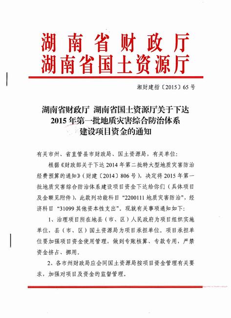 湘财建指[2015]65号:2015年第一批地质灾害综合防治体系建设资金