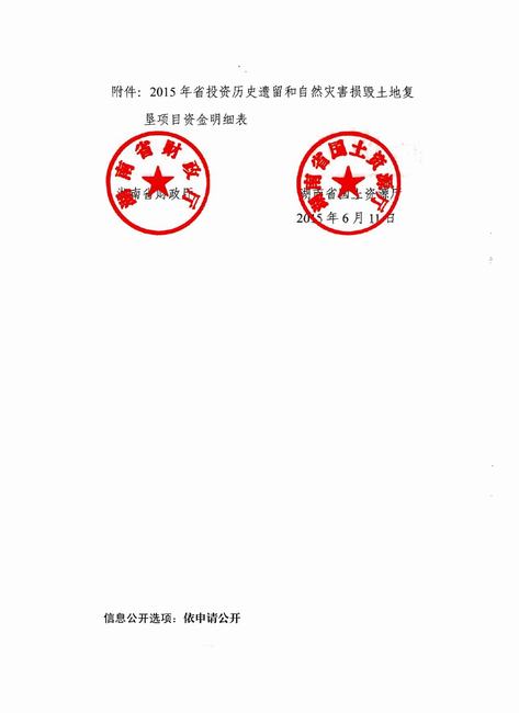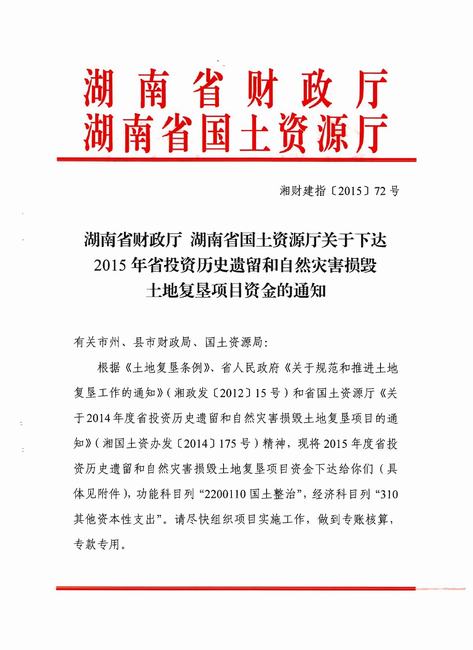 湘财建指[2015]72号:2015年历史遗留和自然灾害损毁土地复垦项目资金