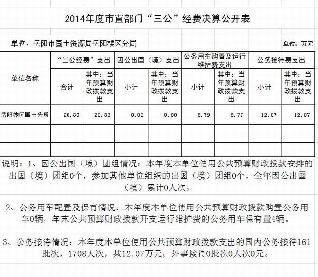 2014年度岳阳市国土资源局岳阳楼区分局“三公”经费决算公开表
