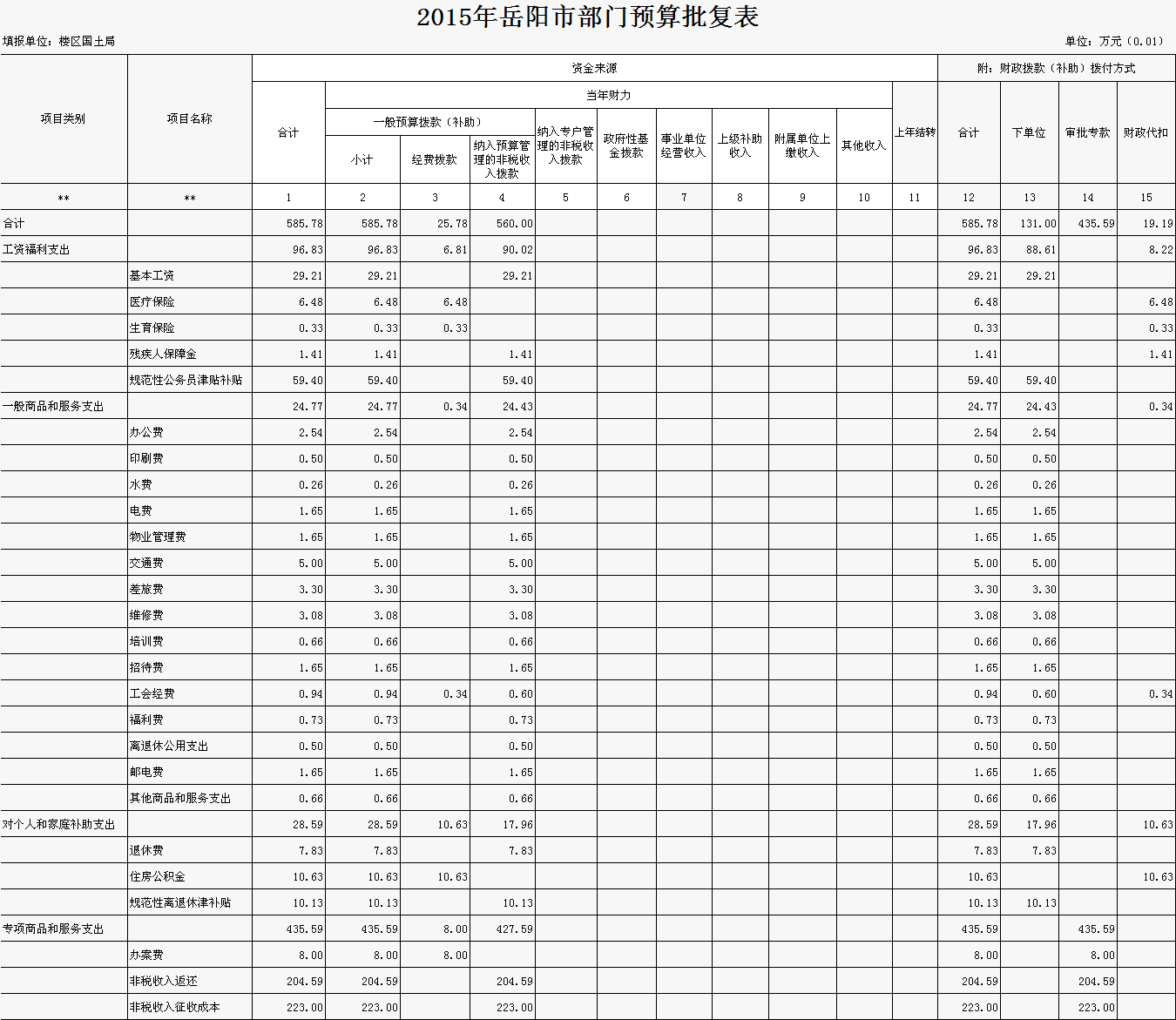 2015年度岳阳市国土资源局岳阳楼区分局部门预算批复表