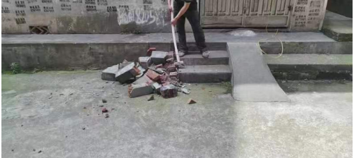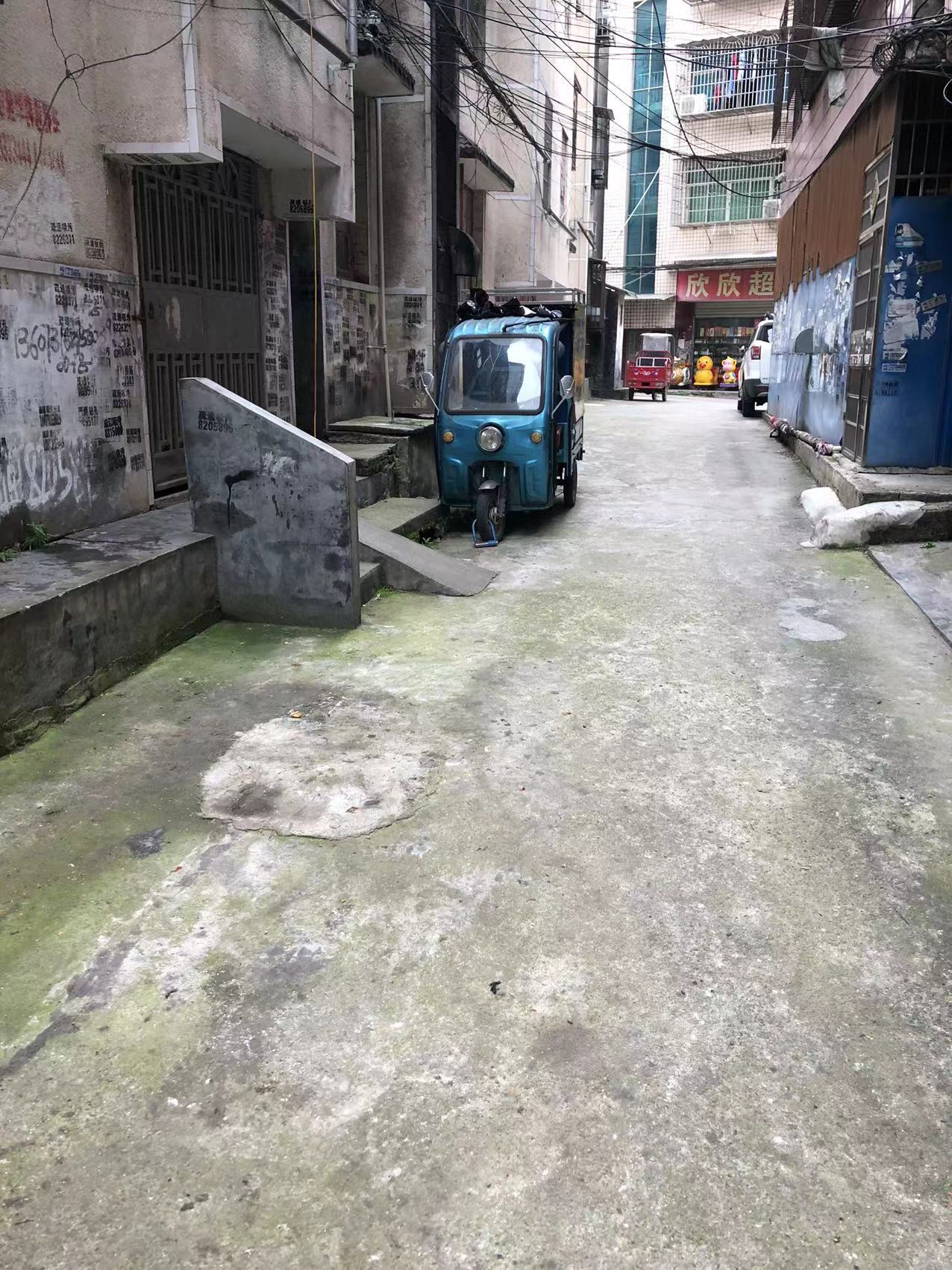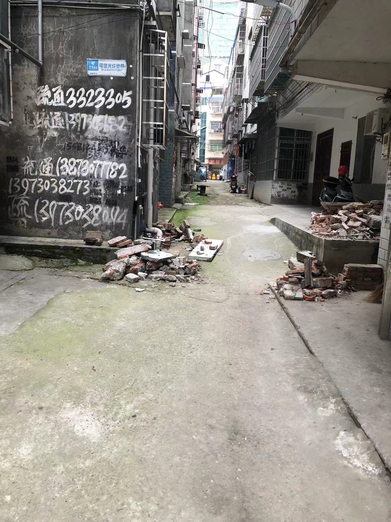 这边都是二十多年的私房,原本地基规划就是参差不齐,五排房子没有一条巷子是直的,原本三米多宽的通道还被各种违章建筑占用,有的水表井盖高出地面二三十厘米,有的直接在屋前搭棚,把通道占用得只剩两米多宽。