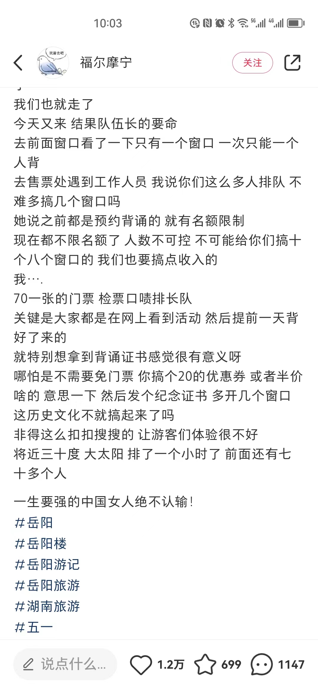 | 回复内容: | 尊敬的市民: 您好,您的来信已收悉,现就您提出的问题回复如下: 一、今年五一期间,参与背记活动的游客热情高涨,参加人数远远超过了预期,导致出现了排长队的情况,加之天气炎热,给不少游客带来了不佳的体验感。我们立即召开专题调度会,优化调整了背记活动方案。 二、非常感谢对岳阳楼景区的重视与关心,我们将进一步强化服务意识、优化背记活动方案,以更加便捷、高效的模式,为广大游客提供优质的服务。同时,也希望广大游客一如既往地对我们进行监督,给我们提出宝贵意见和建议。 感谢您对市城投集团的关心和支持! 2023年5月8日 市城投集团 |