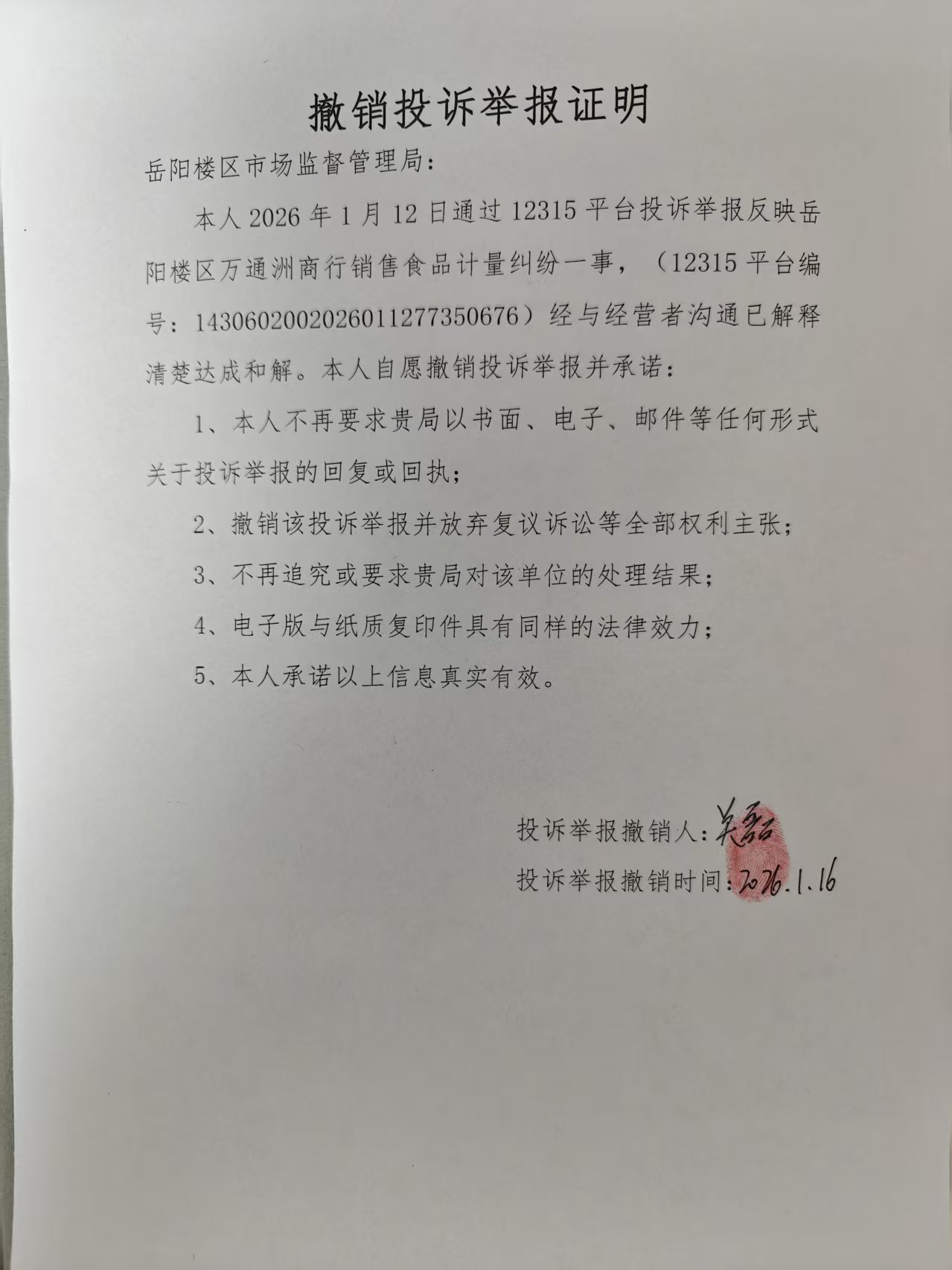 | 回复内容: | 尊敬的网友: 您好!您关于《咨询岳阳市人民政府》的留言已收悉。岳阳市人民政府12345热线服务中心将来信转交至岳阳市市场监督管理局,岳阳市市场监督管理局现就有关办理情况回复如下: 2026年1月23日,接到市长信箱信件(编号:220787):您举报在岳阳市岳阳楼区枫桥湖街道新胜社区三网格126栋的抖音店铺岳阳楼区万通洲商行购买了盐焗鸭腿,外包装标识净含量110克一袋,实际净含量在70克至80克区间,您认为存在欺诈消费者权益和广告虚假宣传的行为。要求我中队对该商行进行核实处理。2026年1月26日我中队执法人员对该经营场所进行核实,情况如下:1.该实际地址为湖南省岳阳市岳阳楼区枫桥湖街道新胜社区三网格126栋301室,名称为岳阳楼区万通洲商行;2.该地址未发现有生产企业在生产加工食品,只有经营者在自家店内经营网店销售上述食品,现在已经全部下架停止销售,该批次产品商家能够提供供货商资质证明和进货票据;3.您就同一件事多次投诉举报后,2026年1月16日经过与商家自行协商后达成赔偿协议,商家同意赔偿1000元钱后不再追究,您表示同意并向商家发来撤诉书。 您咨询的相关政策建议联系告知您处理结果的工作人员。 岳阳市市场监督管理局 2026年1月27日 |